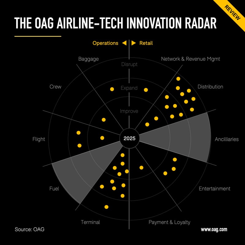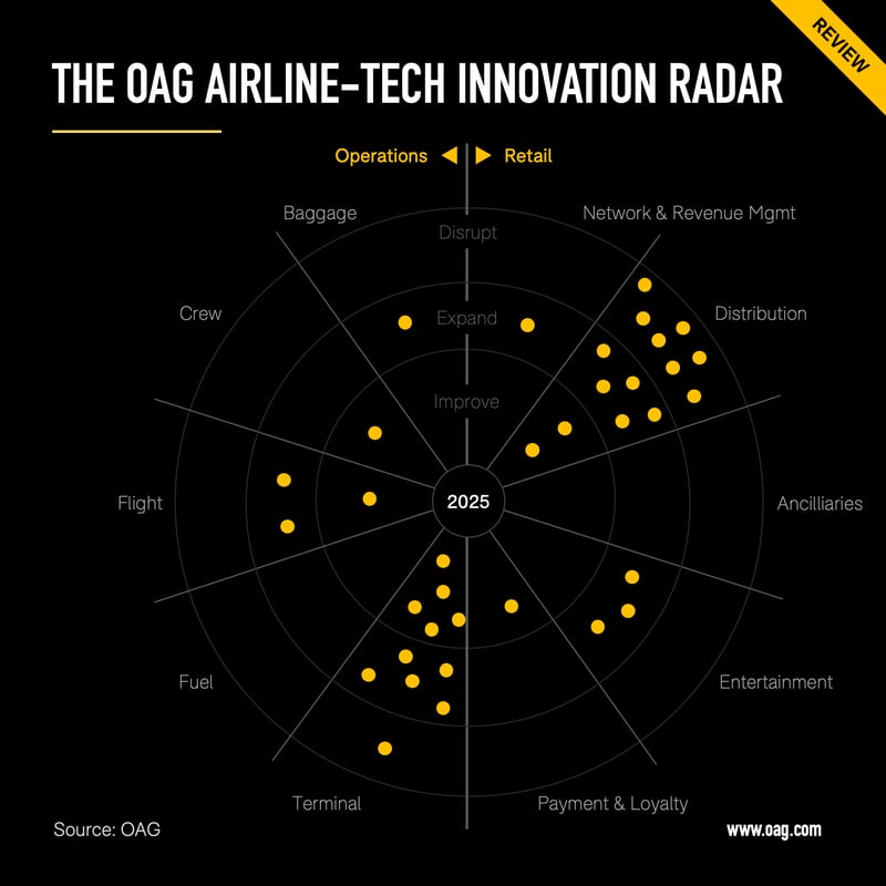 Throughout 2025, the OAG Innovation Radar tracked 35 innovations across airline operations and retail (from small, incremental improvements to genuinely disruptive shifts). Month by month, these developments appeared as individual signals in our Travel-Tech LinkedIn Newsletter series. But when viewed together, they reveal something far more meaningful than any single announcement ever could.