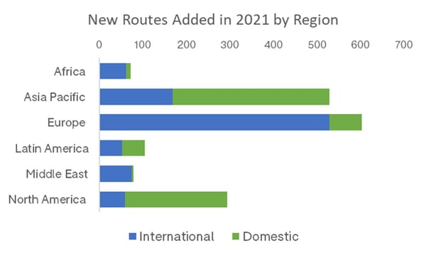 By far the greatest volume of air routes added in 2021 so far are in Europe, with just over 600 new routes added, 43% of the total. Of these, more than half will operate within Europe and international routes account for the biggest share. Many of these previously unserved routes link regional airports across Europe. Other areas seeing airline network experimentation on similar scale are Asia Pacific- where growth in China’s domestic market has resulted in 210 new routes scheduled to operate in 2021. The USA, has 235 new routes with some fifty-three new domestic airport pairs added in July compared to 2019.