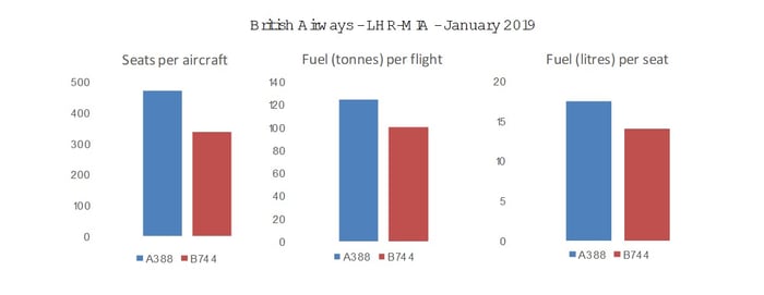 The A388s were larger with around 470 seats compared to 337 on the B744s. They also used more fuel, typically 124 tonnes per flight compared to 100 tonnes for the B744. Putting the combination of seats, and fuel burn together and the B744s win over the A388s for fuel per seat.
