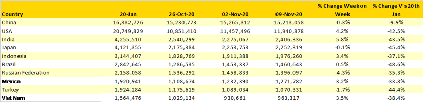 The United Kingdom now reports over a one third (-37.5%) reduction in weekly capacity as the lockdown bites. British Airways who until very recently had been adding capacity back when others were scaling back this week dropped over 100,000 seats a week from their network and effectively confirmed that they will not be operating much from London Gatwick this Winter. EasyJet easily cut another 78,000 seats from their UK network and now have just 18,000 seats scheduled, in January that was some 440,000. The UK is now at just 20% of its pre Covid-19 capacity levels; some 121 airlines operated scheduled flights to the UK in January, that is now down at 75.