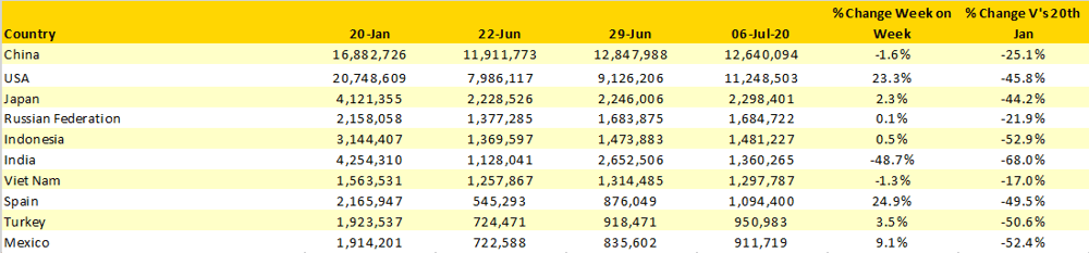 Looking briefly forward the current planned capacity for next week is showing some 55.5 million seats although we expect to see that reduce slightly; capacity cuts are certainly likely in Australia with travel restricted between Melbourne and Sydney although that could be offset by some more capacity returning to the Beijing market as infection rates fall again.