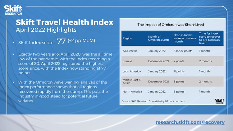 In April 2022 the global Skift Travel Health Index is 77 points (+2 pp MoM). Discover the latest insights from the Skift team in the Skift Travel Health Index: April 2022 Highlights.