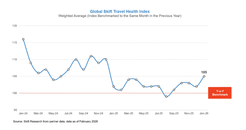 Global travel performance entered 2026 with steady momentum, with the Skift Travel Health Index reaching 105 in January, reflecting 5% year-on-year growth. Keep reading for insights from the Skift team in the Skift Travel Health Index: January 2026 Highlights.