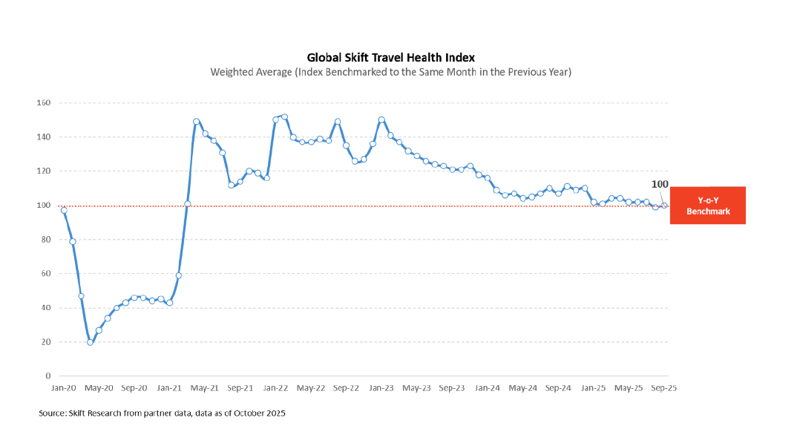 The Skift Travel Health Index held steady at 100 in September 2025, indicating that global travel performance was unchanged from September 2024 levels. Keep reading for insights from the Skift team in the Skift Travel Health Index: September 2025 Highlights.